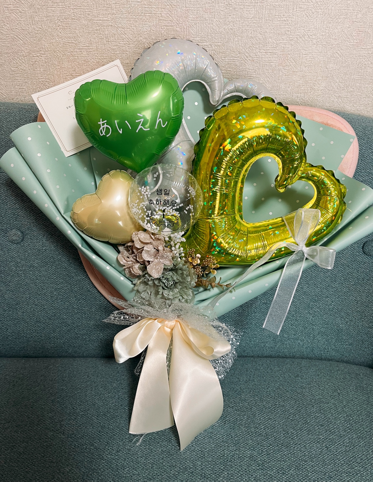 さきちゃん🐹💜から、めっちゃ素敵な贈り物が届きました🎁✨グリーンを基調としたバルーン花束💚超素敵ひらがなであいえんもかわいい🦊💚さきちゃん イエニくんの誕生日お祝いしてくれてありがとう♡めっちゃ嬉しかったよん😍